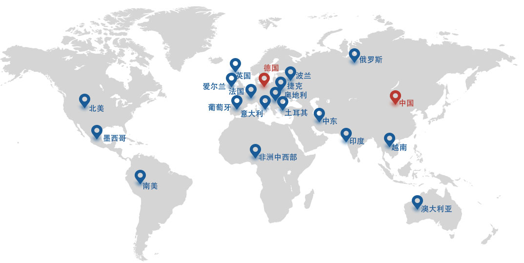 總部德國(guó),全球子公司及辦事處:英國(guó)、愛(ài)爾蘭、法國(guó)、澳大利亞、中東、新加坡、俄羅斯、印度、奧地利、非洲中西部、意 大利、墨西哥、荷蘭、北美、南美、波蘭、捷克、葡萄牙、土耳其、越南、中國(guó)等34個(gè)國(guó)家級(jí)地區(qū)