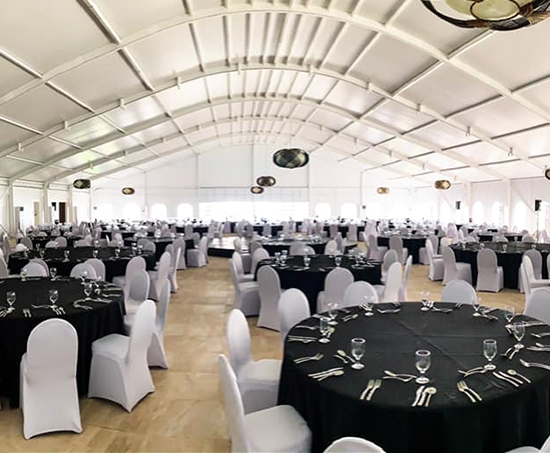 這座篷房需要容納2000人到3000人,設計方案為弧形頂篷房,跨度30米,長度60米,屋檐高度4米,邊墻一半為透明玻璃墻,一半遮光用到的是硬體ABS板墻體。也根據客戶的要求中間增加一個隔斷,將篷房一分為二。 另外這座篷房搭配了6套雙開玻璃門,便于人員進出。